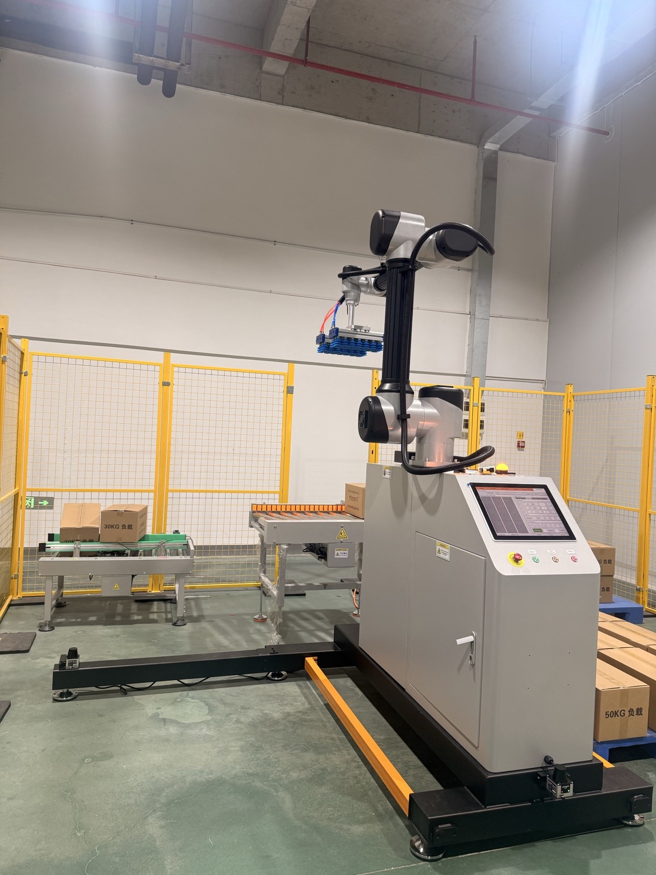 1)Paletizador robótico colaborativo: Los robots, equipados con sensores avanzados y funciones de seguridad, operan de forma segura junto a los operarios, facilitando la integración fluida de procesos automatizados y manuales.